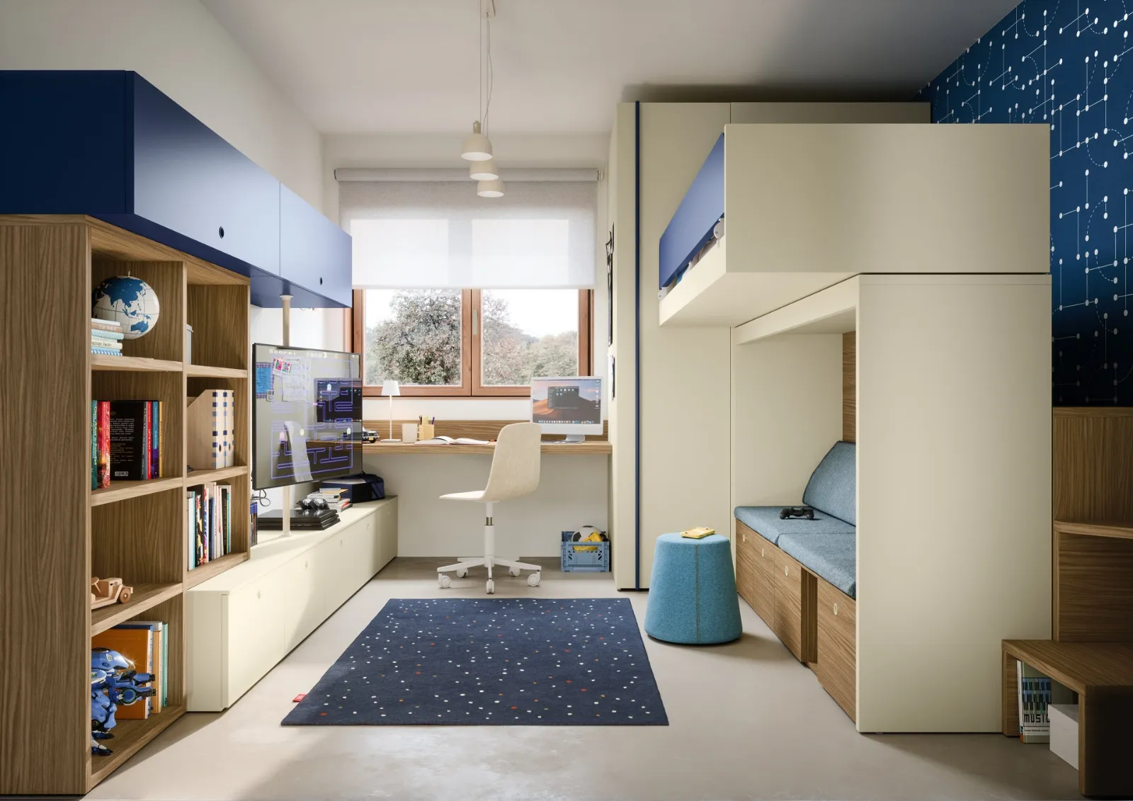 Nell'arredo della stanza dei bambini affidati a noi: in negozio presentiamo tutte le più originali composizioni moderne per la loro camera. Se cerchi spunti creativi per decorare alla perfezione la stanza dei tuoi figli, ti presentiamo la Cameretta con letti a castello Skid di Nidi con finitura in melaminico. Porta contenuto estetico e tonalità vivaci nella stanza dedicata ai più giovani con questa soluzione, una tra le Camerette con letti a castello per bambini di Nidi. Nidi propone una ricca gamma di accessori da accostare su misura: troverai letto, armadio o cabina armadio, scrivania, sedie e librerie.